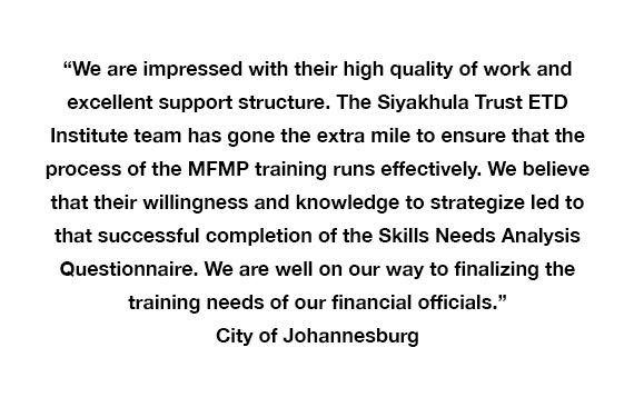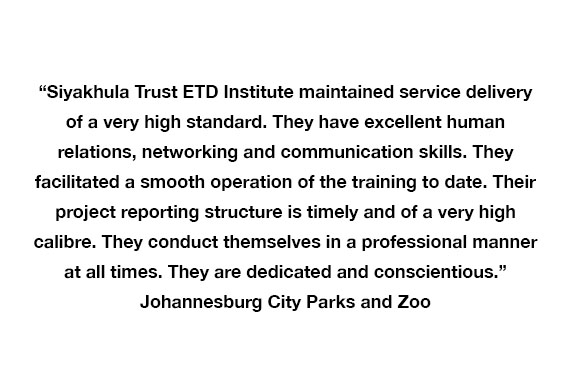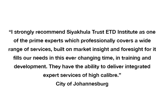 This coupled coupled with total commitment to sound governance, project management and financial controls, makes Siyakhula Trust ETD Institute an organisation you can trust to develop your staff.